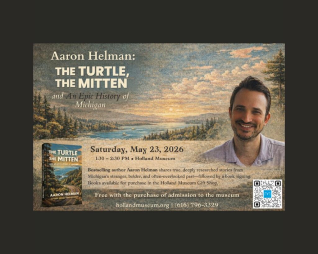 Bestselling author Aaron Helman shares true, deeply researched stories from Michigan’s stranger, bolder, and often-overlooked past- followed by a book signing. Books available for purchase in the Holland Museum Gift Shop.