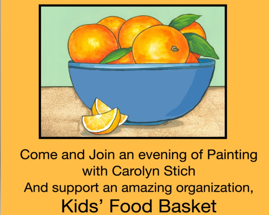 Carolyn will guide you with easy instructions to paint this beautiful bowl of oranges, the symbol of KFB. Absolutely no art experience needed. Light snacks will be available. All proceeds go to Kids’ Food Basket.