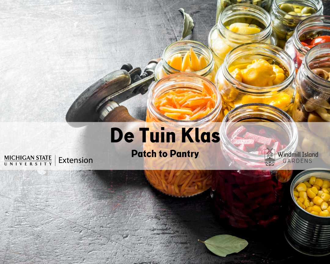 Enjoy the taste of garden grown produce all year long canning and preserving your homegrown fruits and vegetables! Join MSU Extension Food Safety Educator, Erica Reister, at Windmill Island Gardens on Thursday, August 20 from 6:00pm-7:30pm for De Tuin Klas: Patch to Pantry to get the skills to can and preserve what your hard work yielded from the garden this year! Learn to tackle the basics like when is the right time to can, what equipment to use, and how to can and preserve food to make sure it is safe. Learn the logistics of canning and take home some great research-tested recipes and jars to get you started!