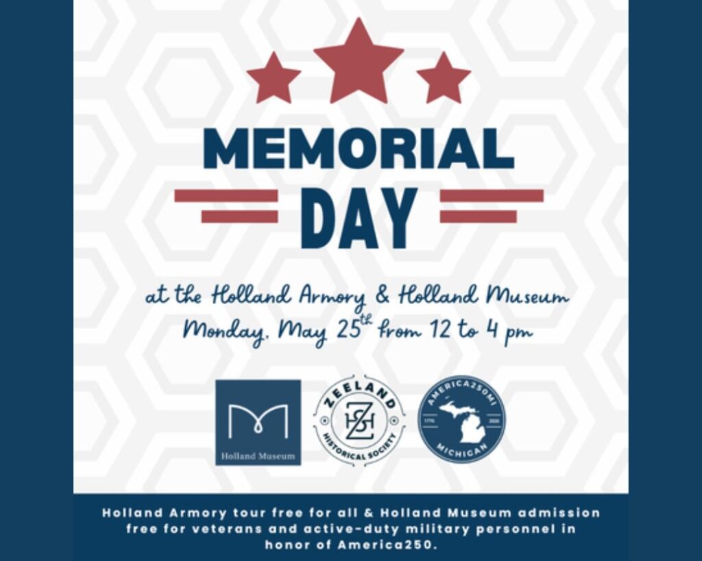 Visit the Holland Armory and the Holland Museum this Memorial Day for a special community open house honoring service and sacrifice. Enjoy a free tour of the Holland Armory’s Company D Exhibit that highlights the legacy of the unit founded in 1920 by Col. Henry Geerds. Following this tour, head over to the Holland Museum where veterans and active-duty military receive free admission and can view our Medal of Honor display along with our other exhibits. This program is in partnership with the Zeeland Historical Society and part of our America 250 Program series.