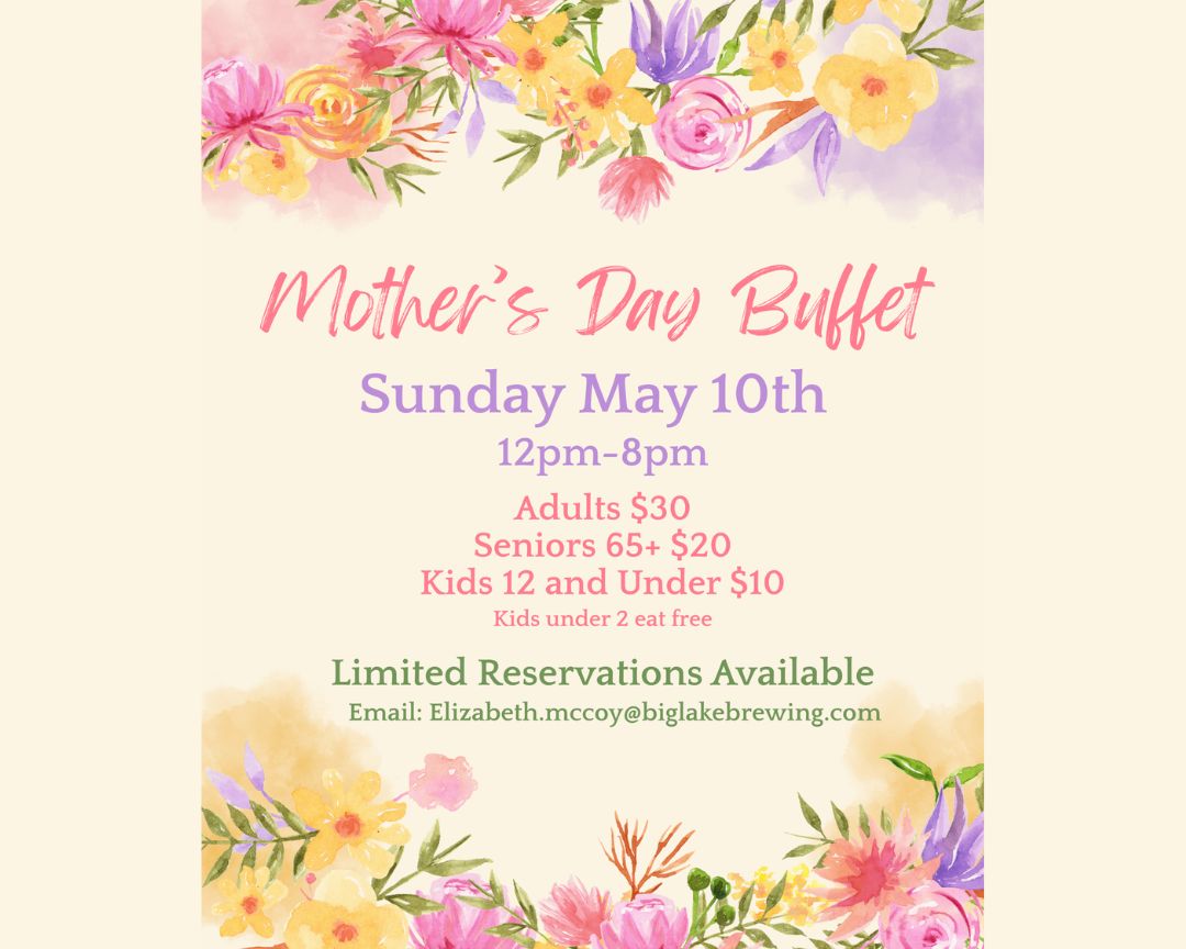 Big Lake Brewing will be open on Sunday May 10th for a Mothers Day and Hope Graduation Buffet featuring a soup and salad bar, slow-roasted prime beef, grilled chicken bruschetta, lemon pepper baked cod, citrus roasted pork loin, a variety of pastas and pizzas, a kids-food station, and more! There will not be regular bar service that day as the buffet will be on the bar and to ensure everyone stays comfortable all dining will be indoors that day.