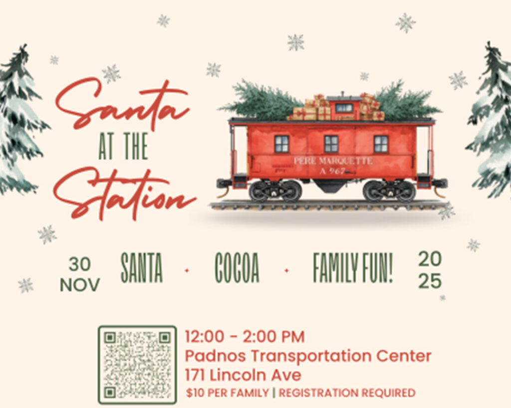 After your photo is taken, hop inside the Padnos Transportation Center to warm up with a cozy cup of cocoa! The cost for this event is $10 per family, and pre-registration is required. Handicap parking is available at the Padnos Transportation Center. All other guests should plan to park at the 7th Street Parking Ramp.
